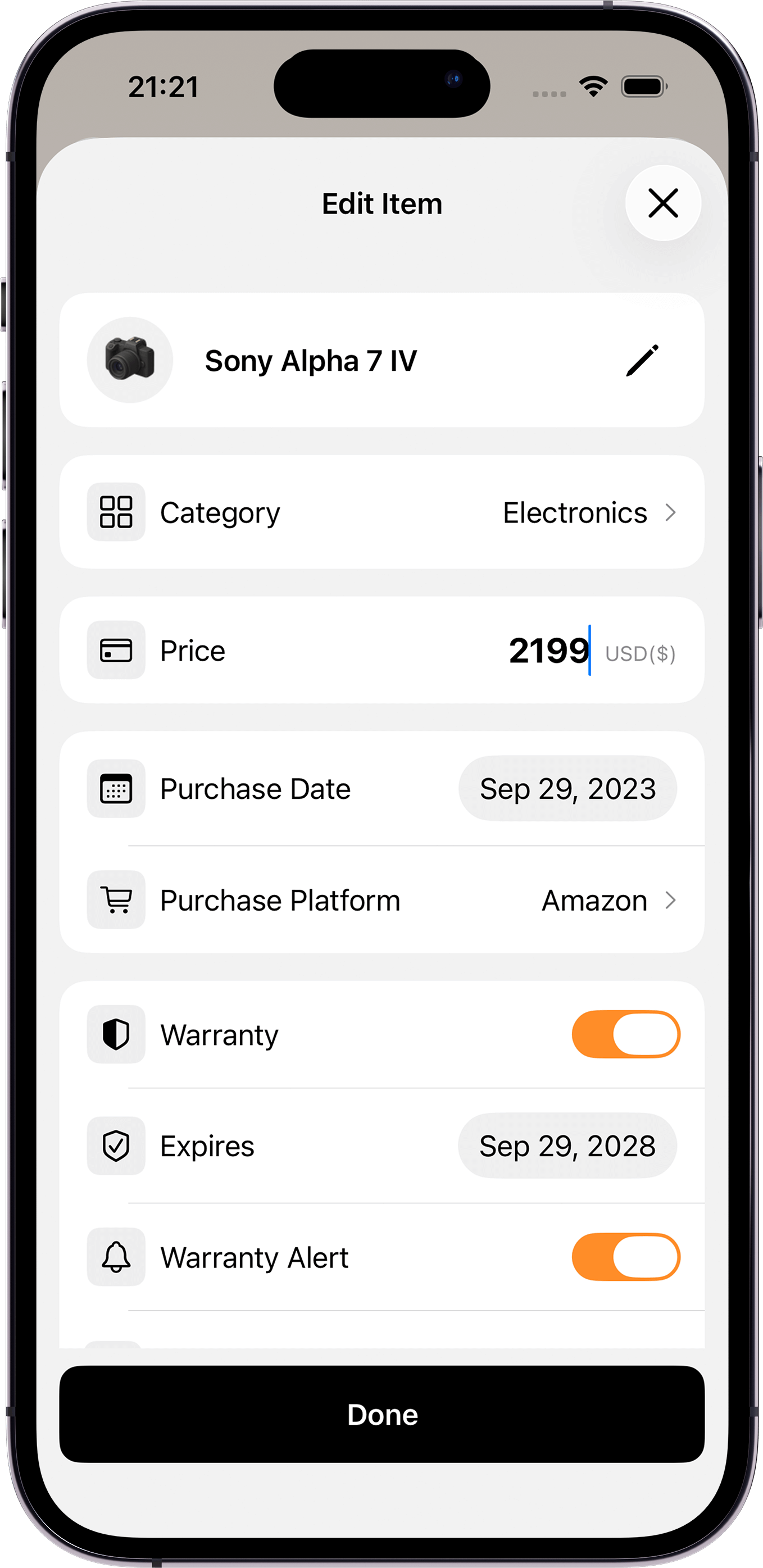 The private, local-first iOS app for total inventory control. Automatically calculate daily costs, organize receipts, and store warranty cards securely on your device.